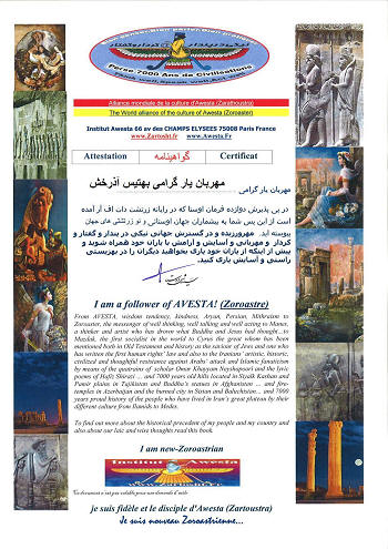گواهی نو زرتشتی : در صورتیکه مایل بدریافت گواهی زرتشتی هستید نخست بطور کامل این سایت را دست کم یک ماه مطالعه کنید پس از آن با ایمیل با ما در تماس باشید و عنوان ایمیلتان 7000 سال باشد zartosht@zartosht.fr با سپاس |